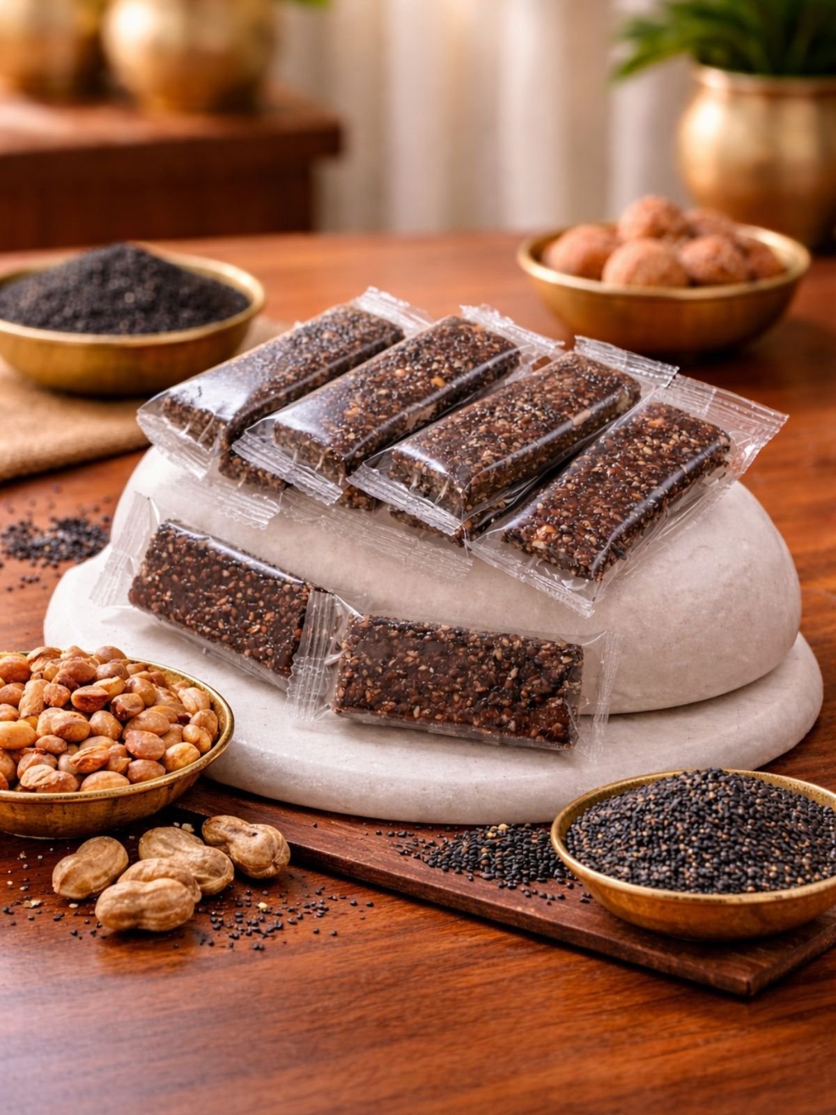Prepared with high-quality Black sesame seeds and pure jaggery, Black Sesame Chikki is a mineral-rich traditional sweet known for its nourishing properties. Its naturally dense nutrient profile supports bone strength and vitality, while the nutty flavor makes it both delicious and functional. A perfect preventive snack rooted in time-tested Indian food wisdom.